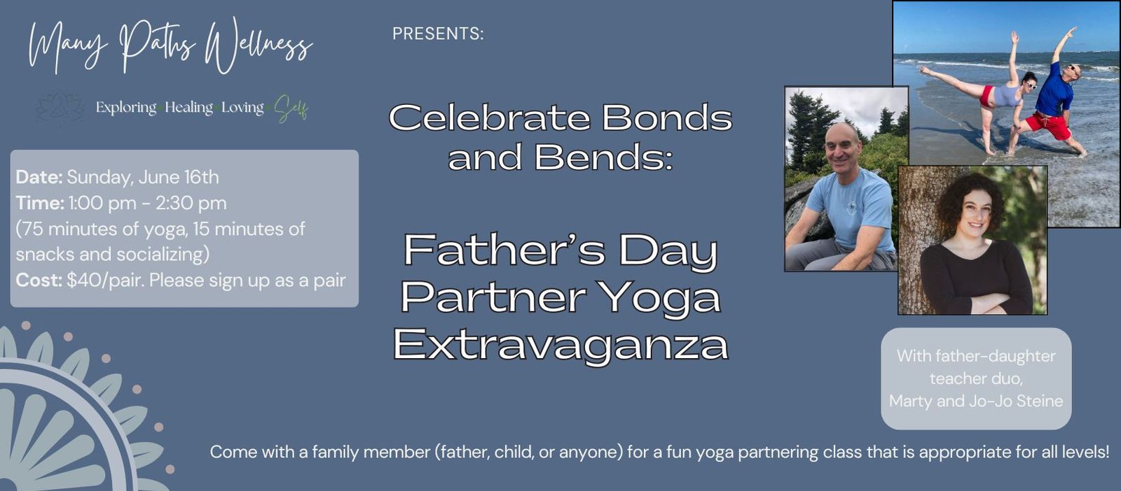 This Father's Day, we're offering something extraordinary for you and your special someone—be it your dad, your child, or a dear friend. Join us for our Father’s Day Partner Yoga Extravaganza, led by the inspiring father-daughter team, Marty and Jo-Jo Steine.